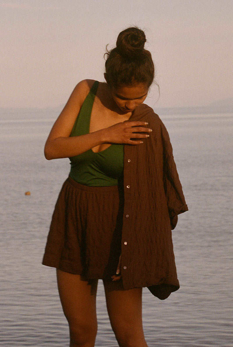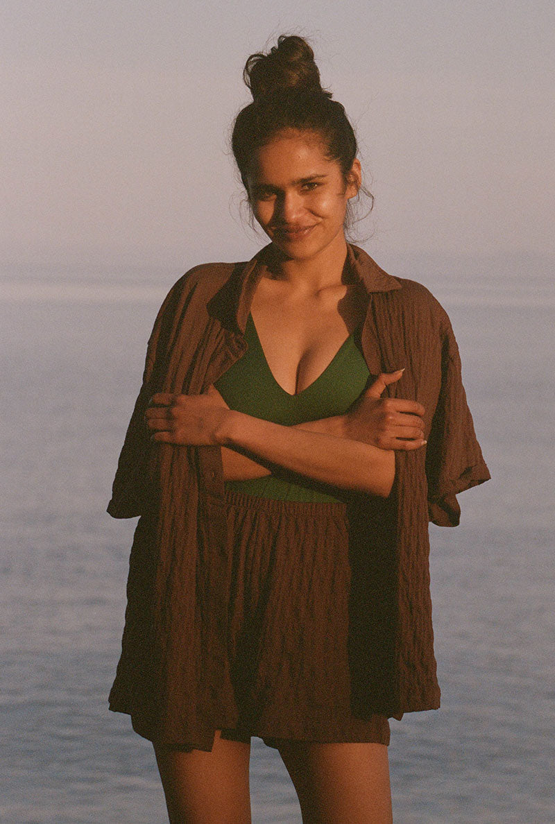 Le conseil de la team N?n?s c?est de le porter en ville avec un t-shirt nou? et une veste en jean. On adore sa jolie couleur marron chocolat qui flatte toutes les carnations ! Le short peut aussi se porter avec la chemise Manta disponible dans le m?me tissu ou peut se mix & matcher avec la chemise Marra ?crue.